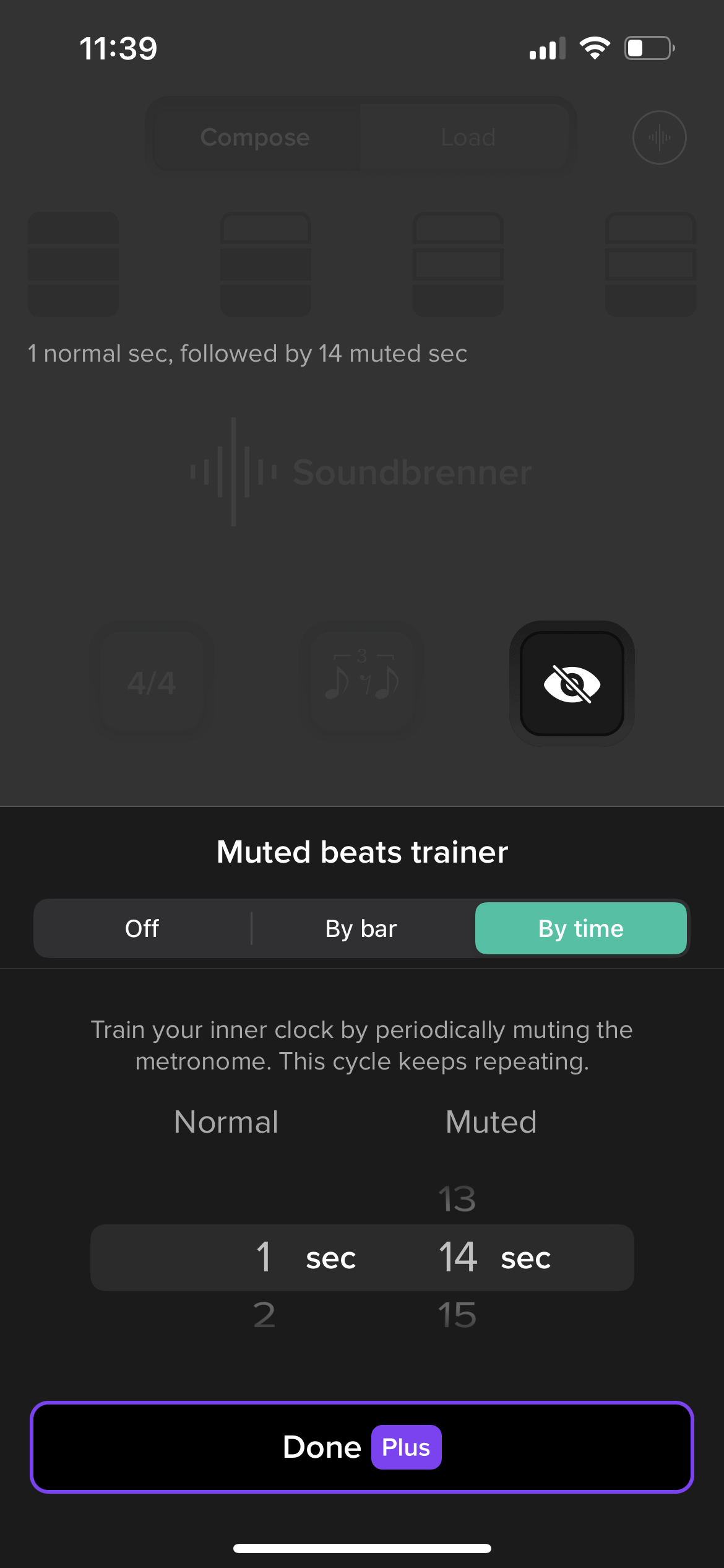 Soundbrenner has made this easier by allowing you to keep the same tempo you're working at and simply mute bars. It should be noted that this feature (as well as some other features) is part of the Pro Subscription plan that gives you advanced features for a monthly fee of $7.99 a month (or a reduced rate if you pay for the whole year upfront).