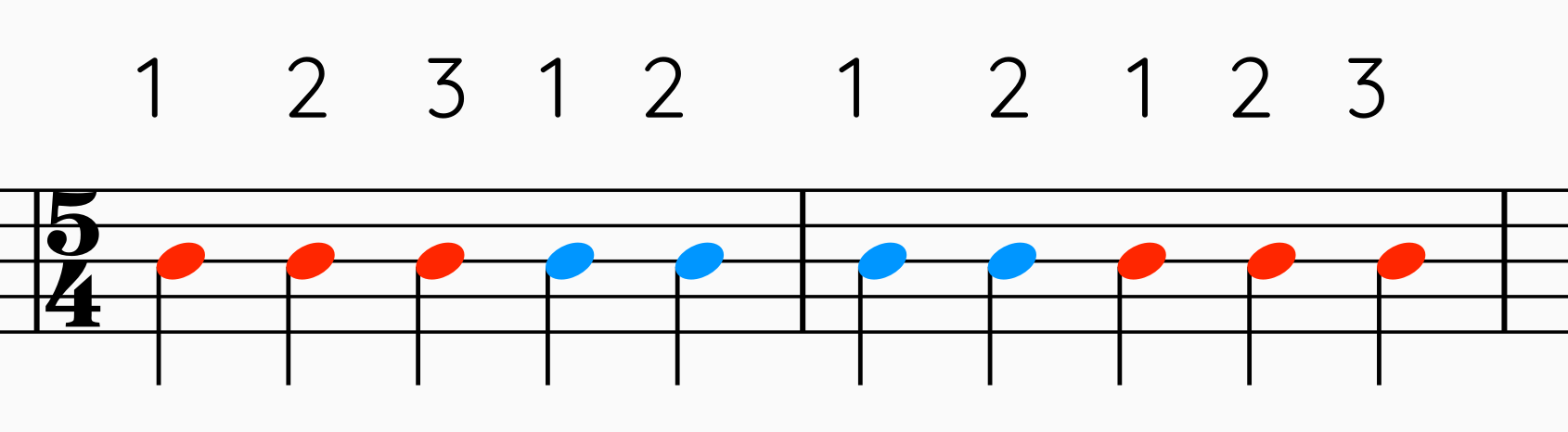 Odd time signatures are often broken into groups for feel. For example, if we have a 5/4 time signature, it's not uncommon for the groove to feel like three beats and two beats or two beats and three beats.